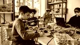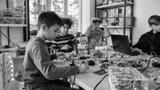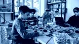 Imagine, create, participate. Young technicians building robots and vehicles, using soldering iron to join chips and wires, programming toys at a stem robotics class