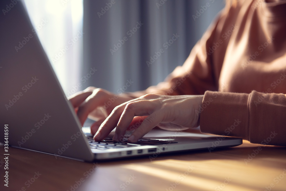 Working from home, Close-up image of young professional female manager using laptop, businesswoman working from home via portable computer, Corona virus.
