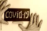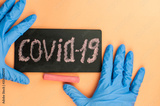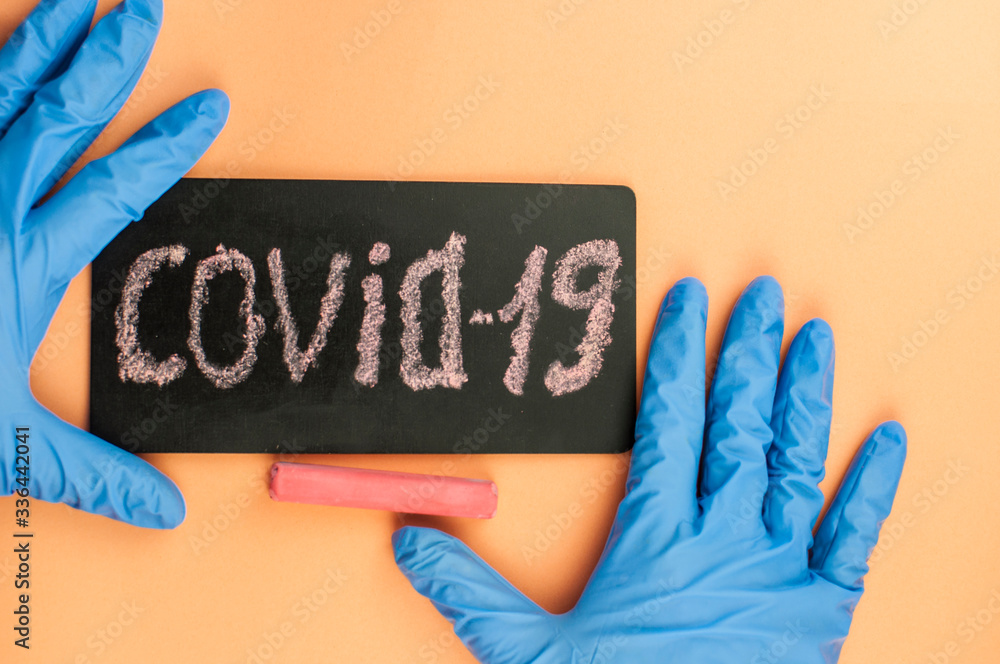 Covid-19 word written on a small blackboard hold woman hands in blue medical glove. Protection concept