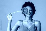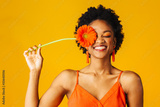 Portrait of a happy young woman holding orange Gerbera daisy covering her eye with eyes closed