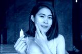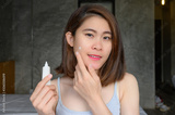 Portrait of young Asian woman holding cosmetic tube and applying acne cream/moisturizer on her face for treat her skin. Conceptual of beauty and cosmetic.