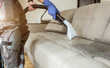 Close up man hand in protective rubber glove cleaning sofa with professionally extraction method. Early spring regular cleanup. Commercial cleaning company concept