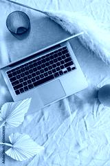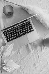 Home office desk workspace with laptop, reeds foliage, fan leaves on beige linen table cloth. Flat lay, top view.