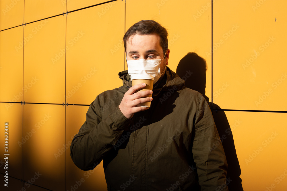 Man wearing mask with cup of coffee, coronavirus, illness, infection, quarantine, medical mask