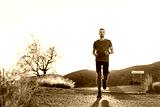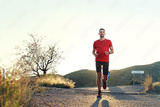 Triatlion, the athlete trains running. A man in sports outfit runs along the mountain trail.