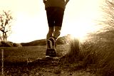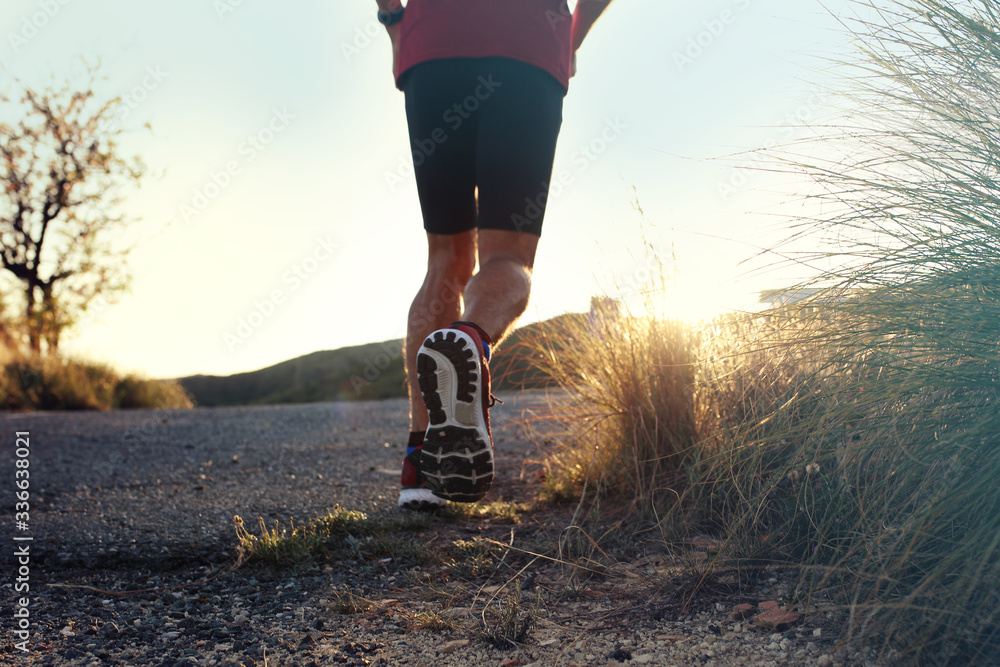 Professional running shoes. A man in sports outfit runs along the mountain trail.