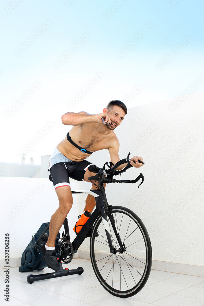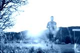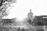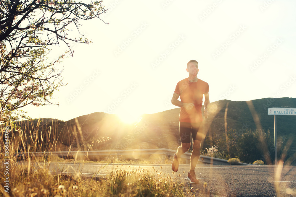 Marathon runner training. A man in sports outfit runs along the mountain trail.