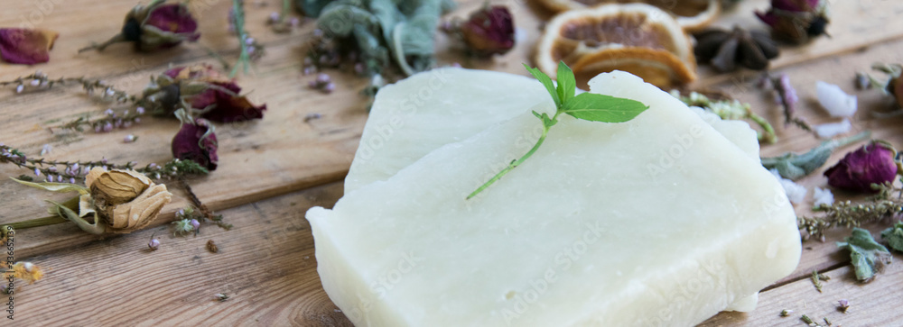Handmade soap bars with herbs on wooden table, soft focus,banner.