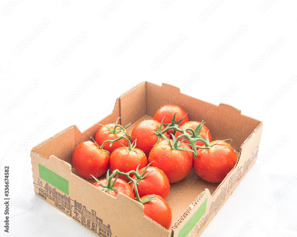Vibrant fresh ripe tomatoes on vine in paper box isolated on white grocery delivery concept