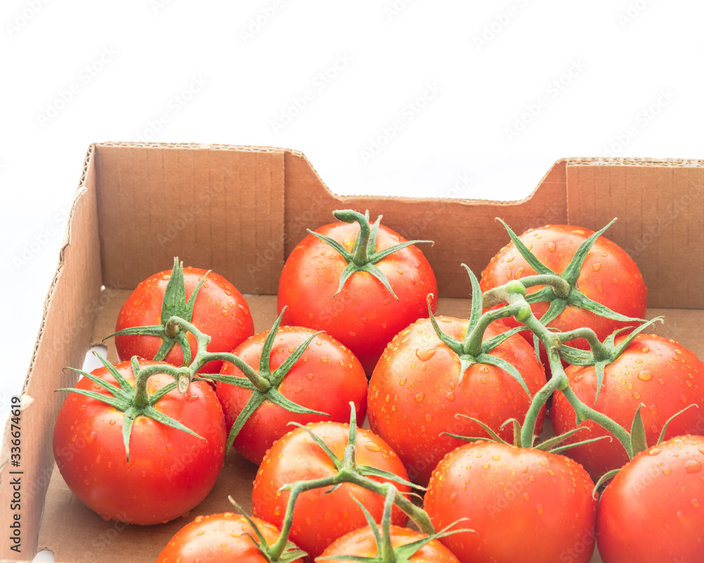 Top view fresh ripe tomatoes on vine in paper box isolated on white grocery delivery concept