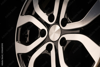 New car alloy wheel, close-up on a black background, wheel elements, two-color coating, shiny.