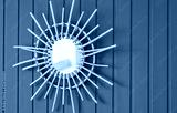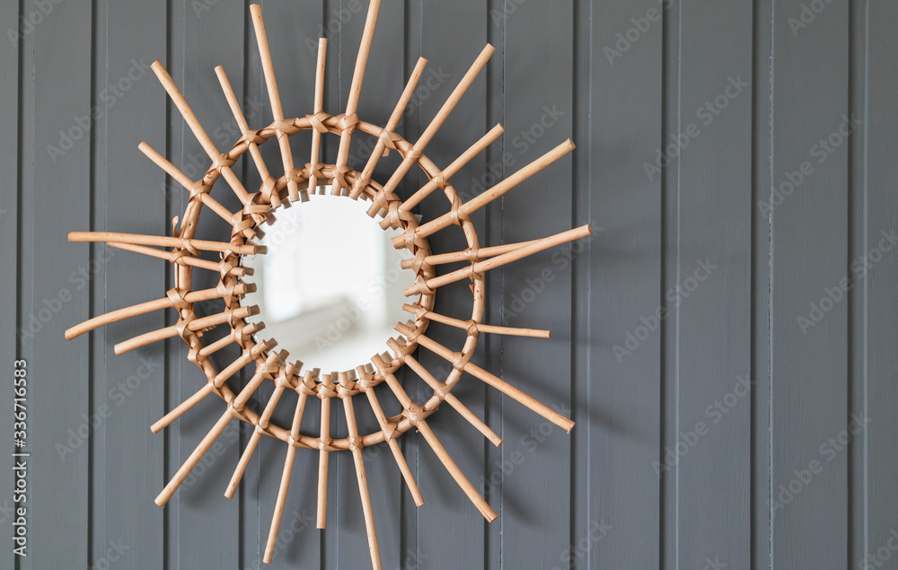 round wooden mirror with bamboo frame with rays on a dark wooden background