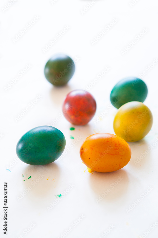 Colorful Easter eggs on white background. Decoration of eggs. Easter celebration with colorful easter eggs. Bunte Ostereier auf weißem Hintergrund. Ostereier kreativ f