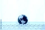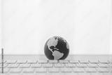 Global Business and Technology Concept. Close up of mini world ball with computer keyboard with copy space.