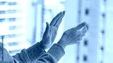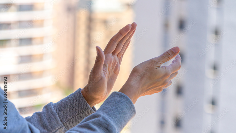 Woman hands applauding medical staff from their balcony. People in Spain clapping gratitude on balconies and windows in support of health workers, doctors and nurses during the Coronavirus pandemic