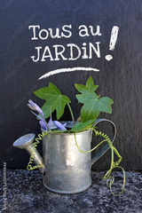 Le jardin ! arrosoir avec arrière-plan ardoise