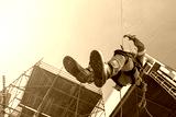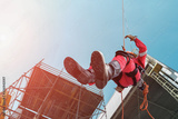 Close up pic of male rope access jobs worker wearing equipment safety full harness, working at height abseiling down from the high-rise construction site on structure steel background.