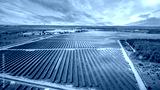aerial view of solar panels on green lawn. drone shot, bird's eye