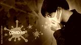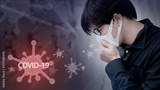 COVID-19 pandemic or Coronavirus infection concept. Asian man coughing with floating virus pathogen on red background. Respiratory droplets transmission protection by wearing face mask.