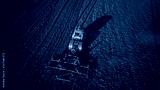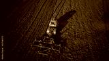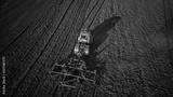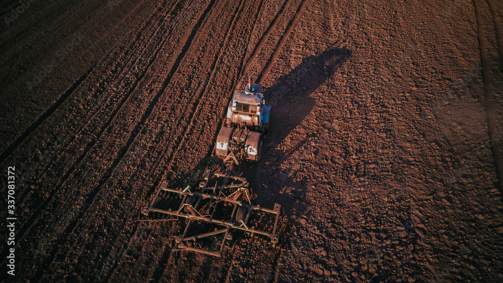 aerial view of tractor , combine cultivating field. drone shot. picture with space for text. Farmland from above
