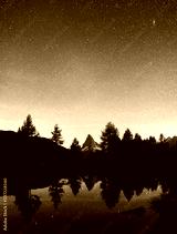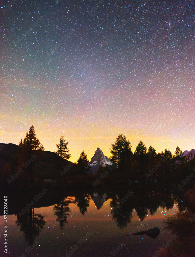 Incredible night view of Grindjisee lake with Matterhorn Cervino peak in Swiss Alps. Millions of stars in the pre-bright sky. Zermatt resort location, Switzerland. Landscape astrophotography