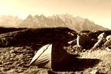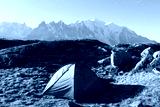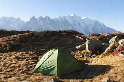 Amazing view on Monte Bianco mountains range with green tent and Monblan on background. Vallon de Berard Nature Preserve, Chamonix, Graian Alps. Landscape photography