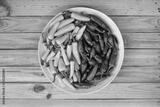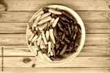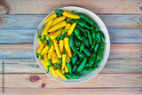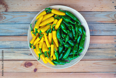 Yellow and green hot peppers on wooden plate closeup. Food photography