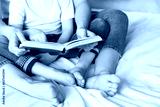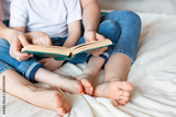 A child and a young woman are sitting on the bed and reading a fairy tale. An open book lies on its knees. Home leisure - reading a book.