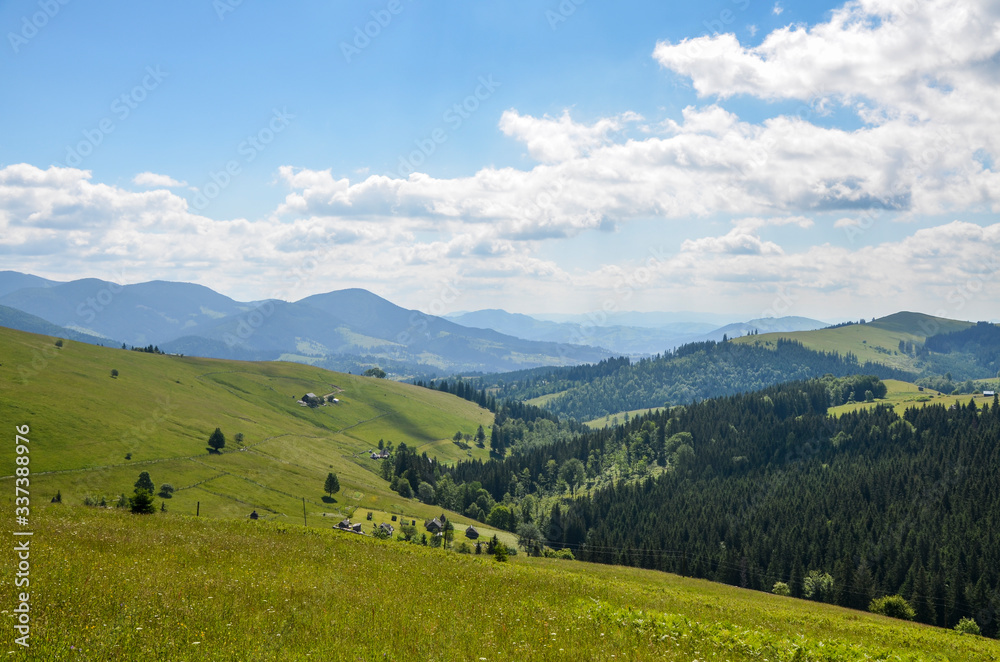 Rural old wooden houses on the edge of a forest on hills and grassy meadow in the Carpathian mountains in Ukraine. Beauty of nature concept background.