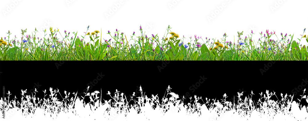 purple clover flowers and grass isolated on white background with alpha mask for easy isolation
