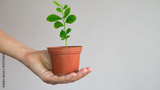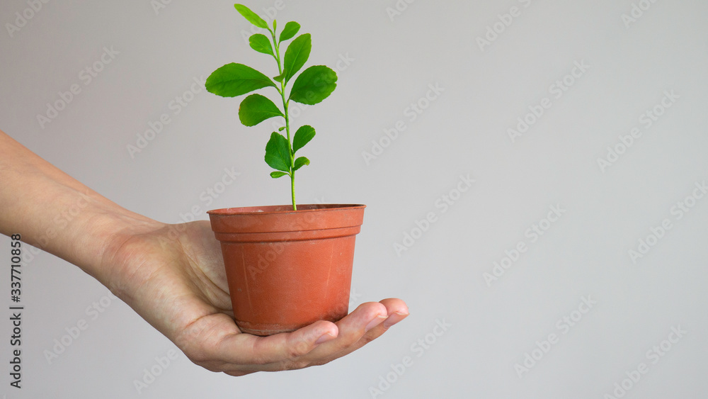 A woman's hand holds a pot of a young lemon tree. Copy space area for advertising.