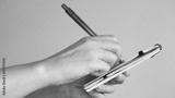 Female hands taking notes in a small notebook with a red pen.