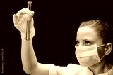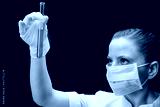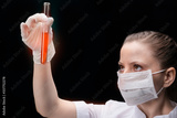 a young medical girl in a medical mask looks at a test tube with tests, with a red glowing liquid. Tests and experiments in the laboratory, the development of vaccines against coronavirus