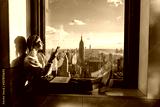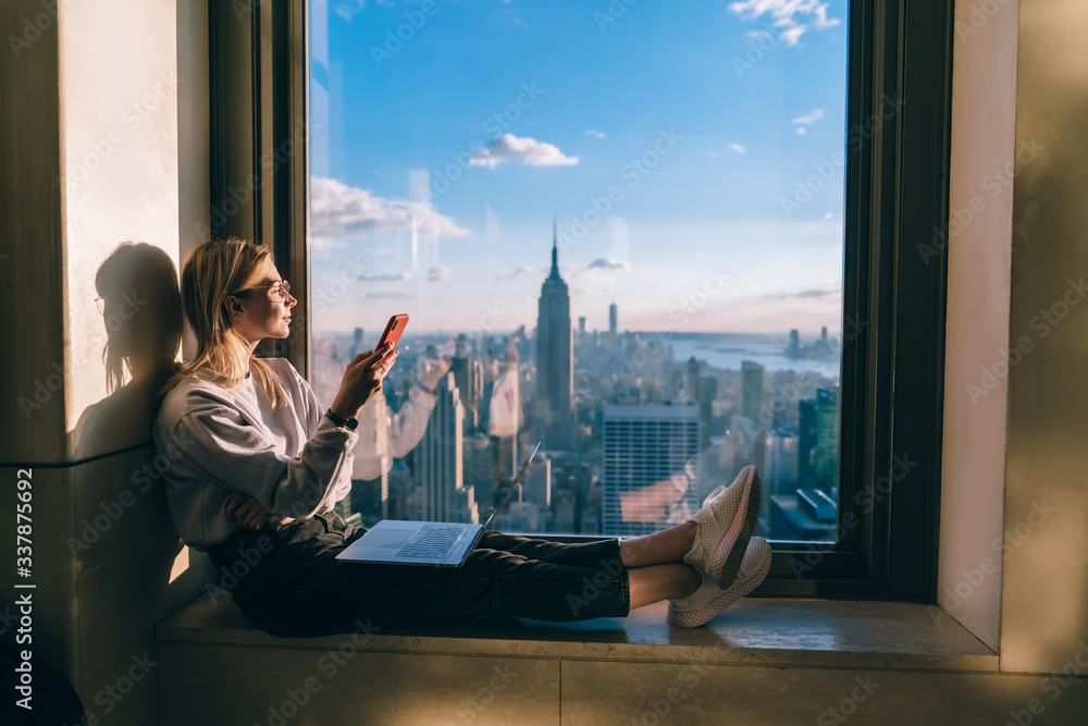 Youthful female freelancer holding modern smartphone device in hand and admiring beautiful scenery view of Manhattan sitting in high rise building with panoramic lookout, remote worker with laptop