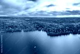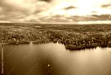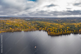 Drone view point of Wooden boat bath on a lake, water area in Autumn with lake Boroye, Valday national park, Russia, panoramic image, golden trees, Wooden lodges, cloudy weather