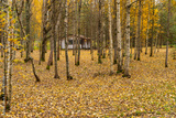 Forest lodge in backwoods, wild area in beautiful forest in Autumn, Valday national park, yellow leafs at the ground, Russia, golden trees, cloudy weather