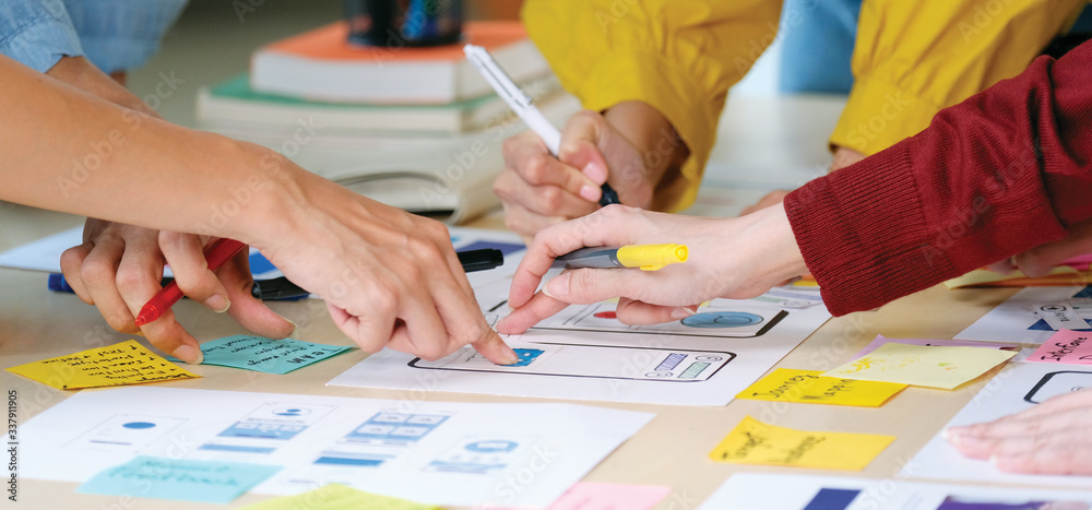 Brainstorm planing creative asian teamwork, Close up of hands mobile phone app developer team meeting for ideas about screen display prototype layout for smartphone, ui, ux startup small business