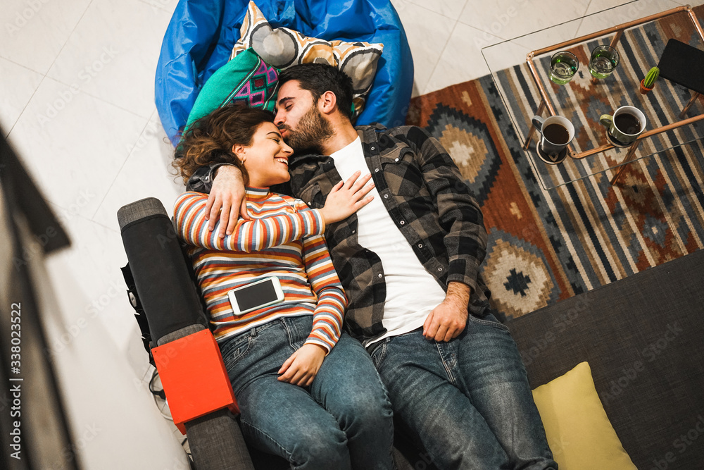Young couple having tender moments during quarantine isolation - Happy people chilling at home - Domestic lifestyle, love, relationship concept - Focus on faces