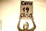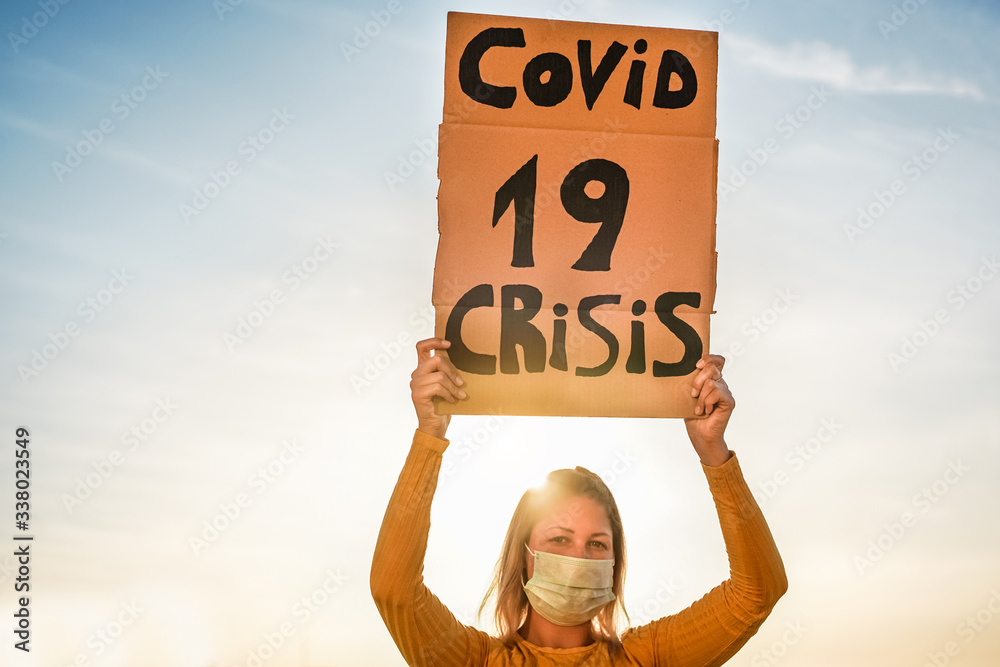 Millennial girl protest for Covid 19 economic crisis - Womand demonstrator wearing face mask for coronavirus prevention - Focus on banner