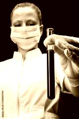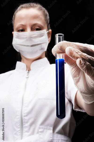 a test tube with a blue substance in the hand of a female medic. Tests or results of a coronavirus test. vertical photo, a girl in a blur in the background.