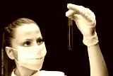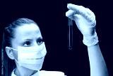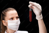 a test tube with a red substance or blood for analysis of the covid-19 coronavirus in the hands of a young woman in a mask, a scientific specialist. she looks at the test tube