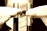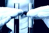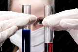 two test tubes, with a blue and red liquid in the hand of a girl in the background. Close up. research or development of a vaccine for covid 19 coronavirus