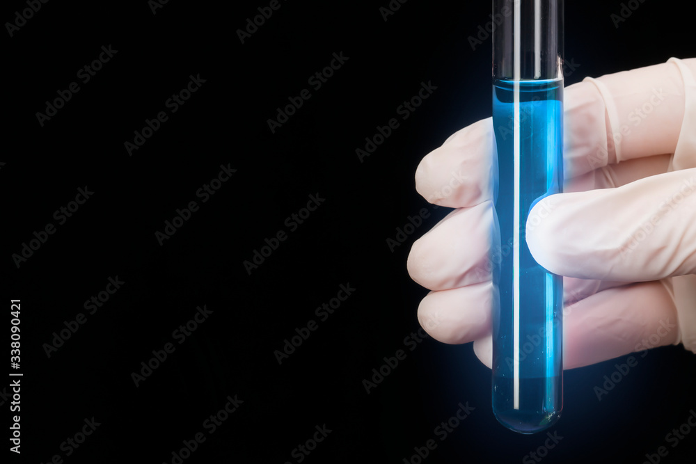 medical test tube with a blue glowing neon liquid in hand, black background. Copy space
