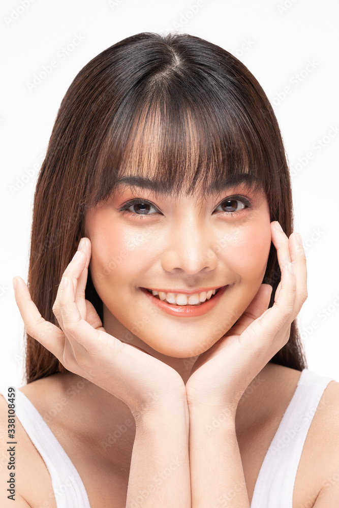 Young Beautiful Asian woman smile touching soft cheek with clean and fresh skin Happiness and cheerful with positive emotional,isolated on white background,Beauty Cosmetics and spa Treatment Concept