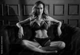 Portrait of a half-naked female model posing in a dark apartment and sunlight while sitting on a dark red sofa, wearing sporty bra and undies