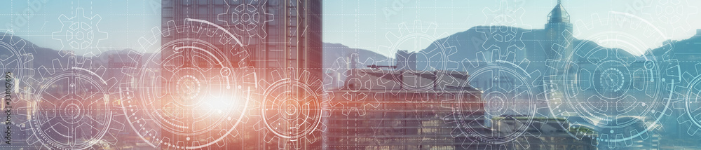 Cogs and gear wheel mechanisms. Hi-tech. Abstract Business and Technology background. Modern night city.