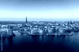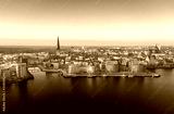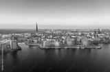 panorama of the city of rostock - aerial view over the river warnow, skyline during sunrise