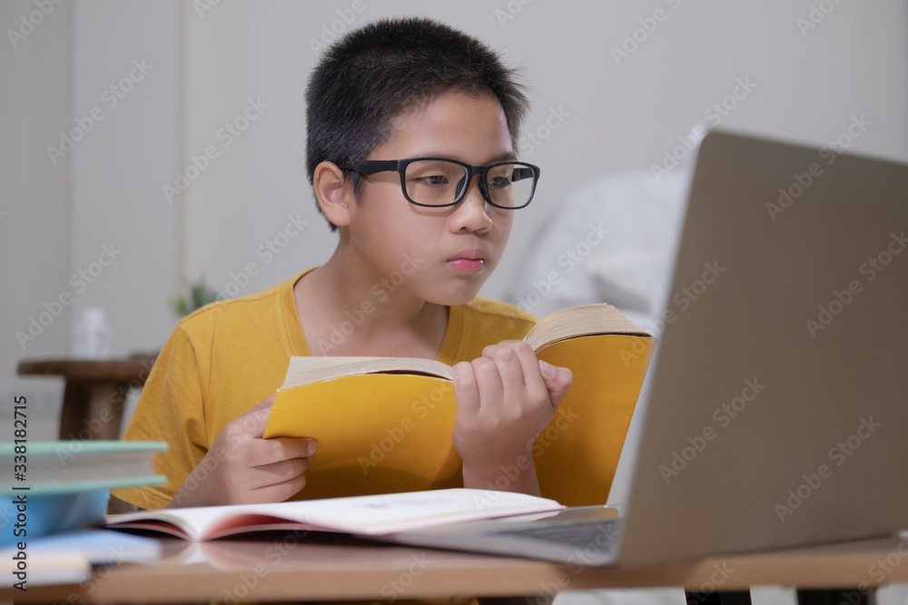 Young collage student using computer and mobile device studying online.