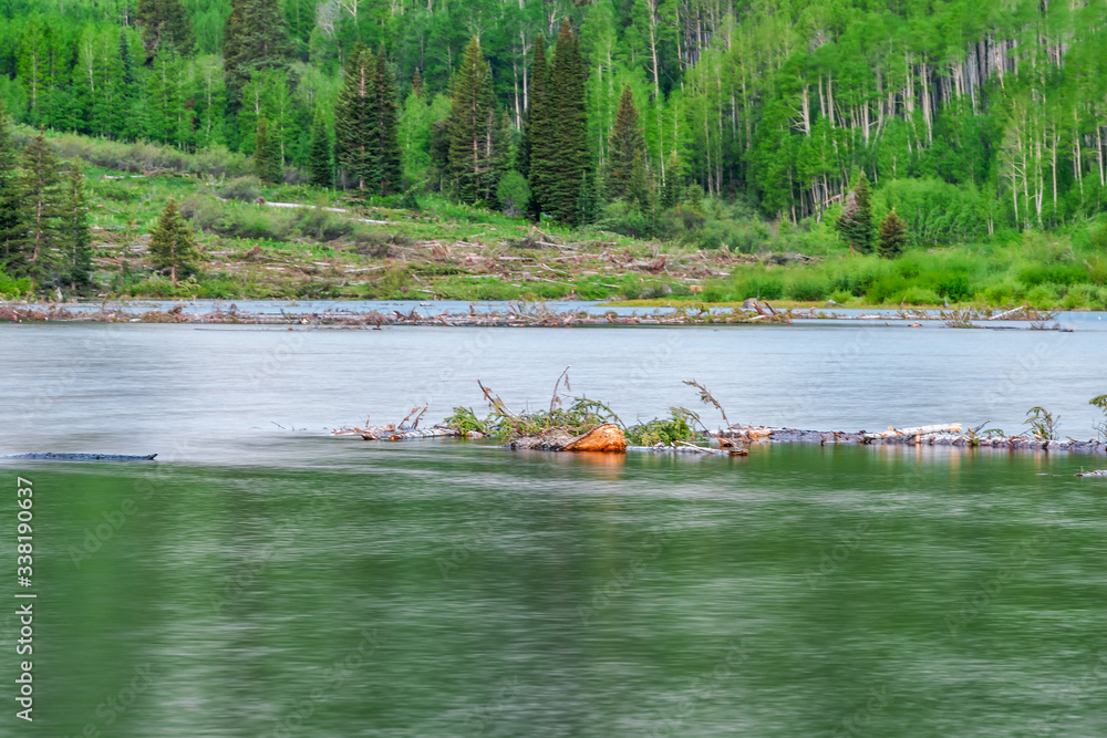 Maroon Bells lake at sunrise in Aspen, Colorado during blue hour dawn with closeup of reflection June 2019 summer