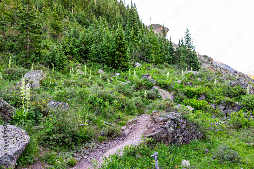 Green meadow field with path and many California False Hellebore flowers on Snowmass Lake hike trail in Colorado in National Forest park